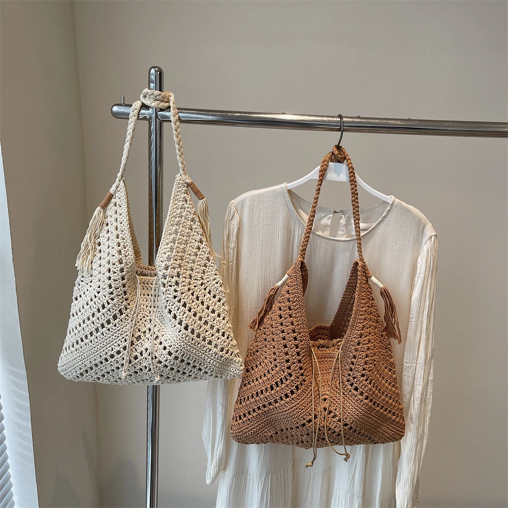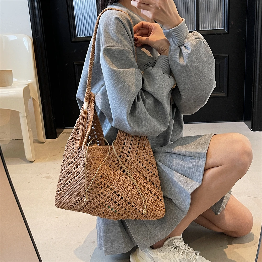 Crochet Shoulder Bag Set. Raffia Boho Rattan Summer Beach Tote.